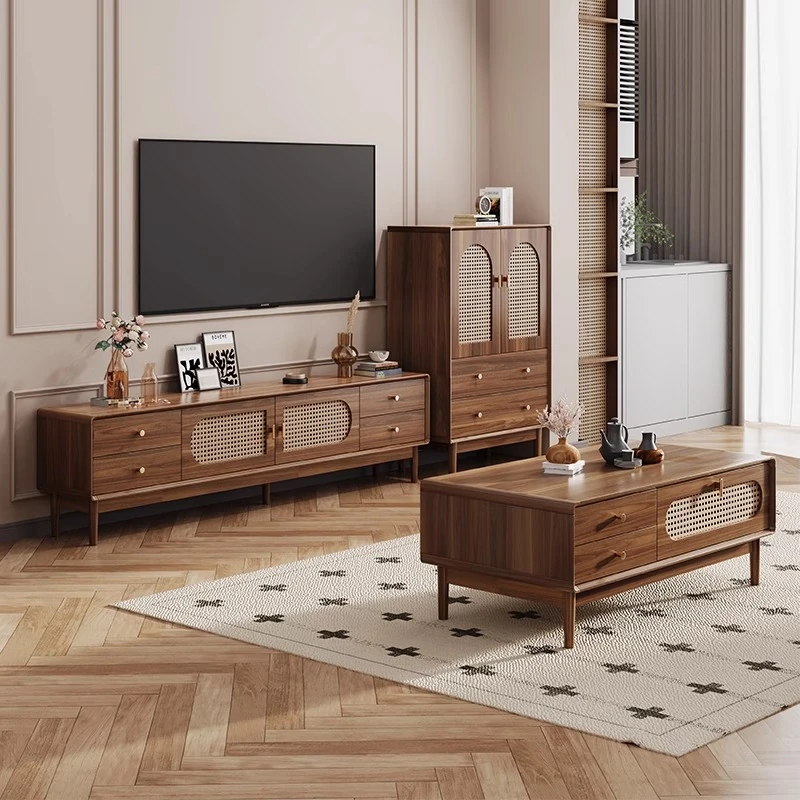 サンパリウ vintage ラタン編みのテレビキャビネット&コーヒーテーブルセット - リビングに最適なコンパクトなデザイン、実用的な収納機能付きの日本式スタイル。おしゃれな無垢材の脚で、小さな部屋にもぴったり!