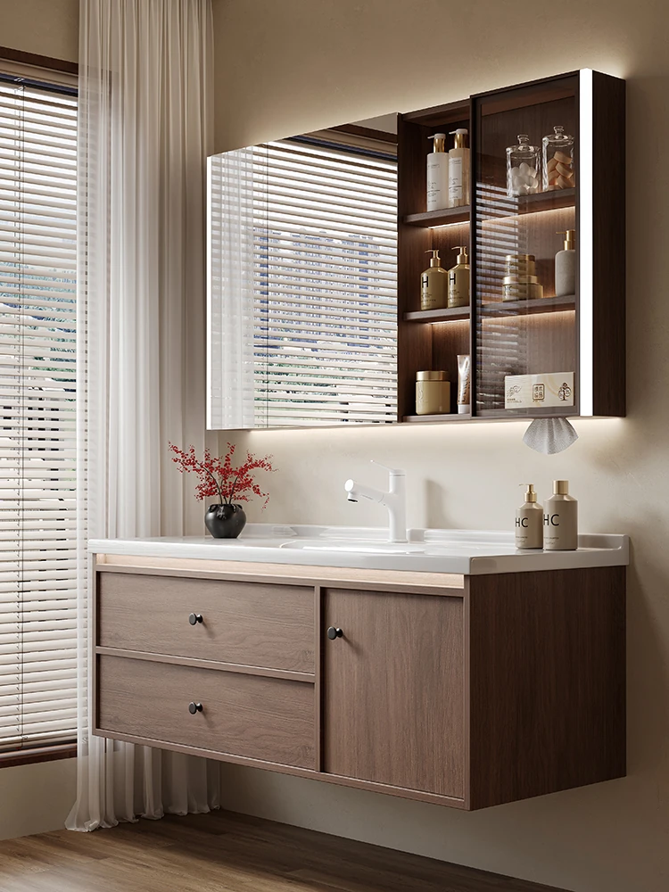 DIPREY Ceramic Bathroom Vanity with Integrated Basin - Elegant Chinese-Style Walnut Brown Washstand for a Modern Touch in Your Bathroom