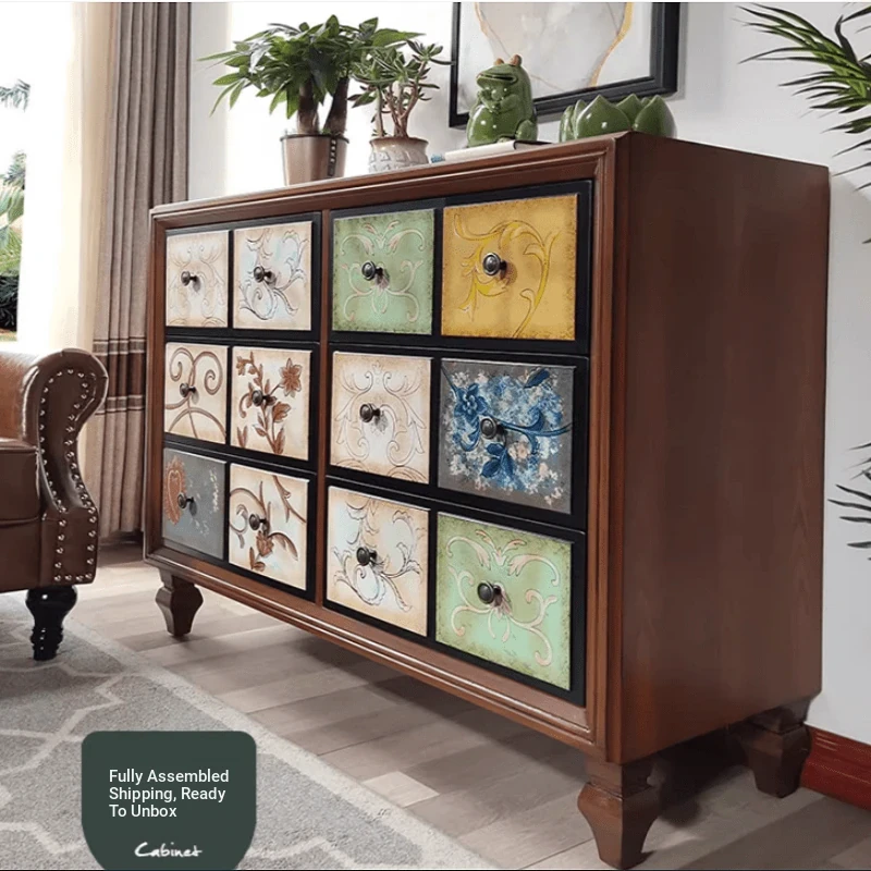 Esme American Style Solid Wood Dresser - Vintage Storage Cabinet with Large Capacity, Colorful Hand-Painted Drawers for Living Room and Balcony Organization.