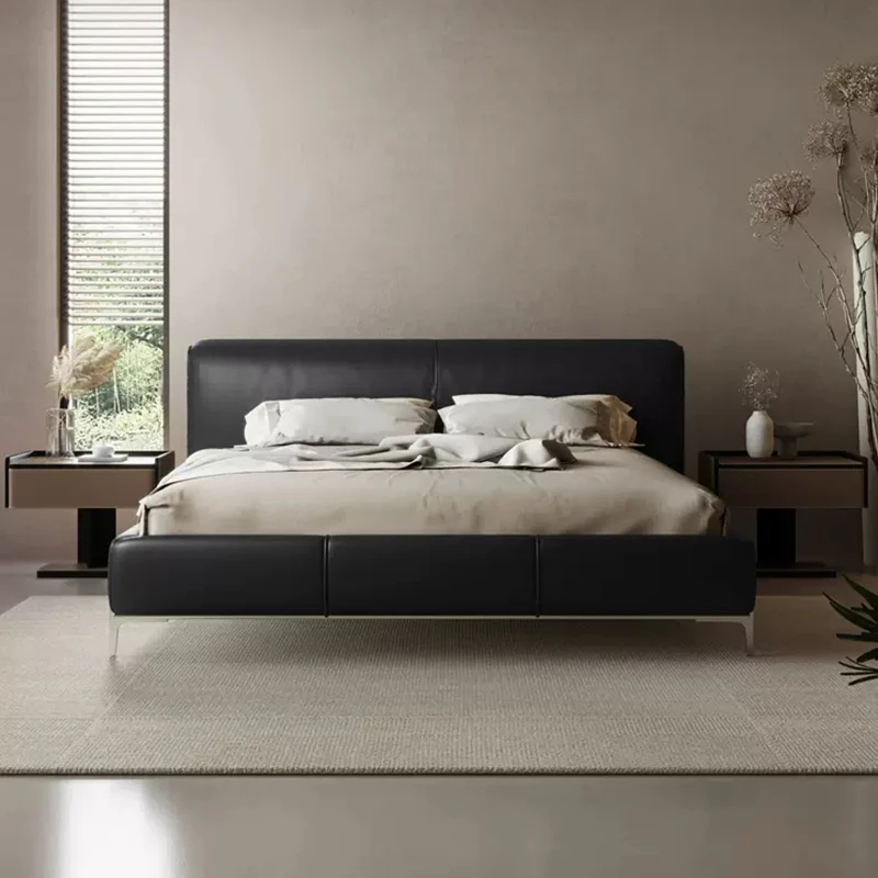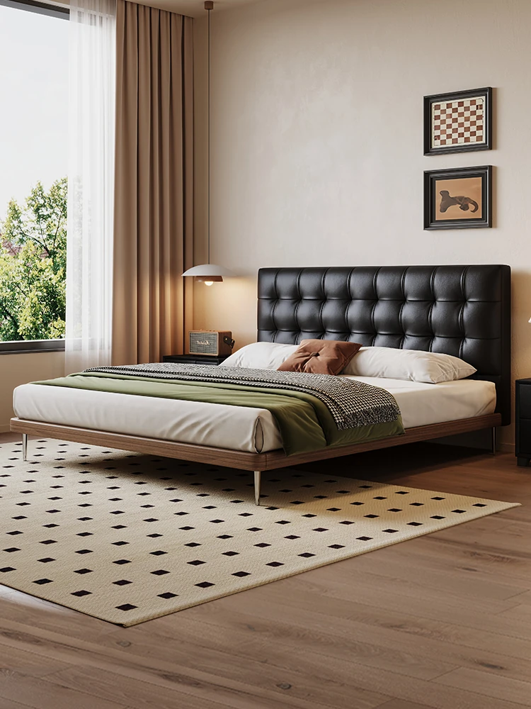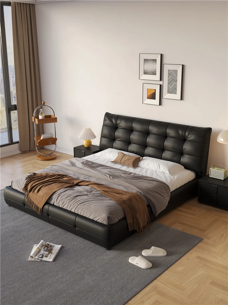 "Yunxin Minimalist Italian Black Knight Leather Bed – Premium Modern Designer Master Bedroom Wedding Bed in Wabi-Sabi Style for Luxurious Living"