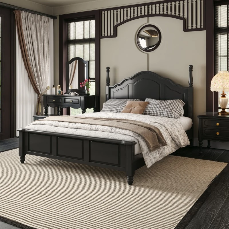 Retro French-Style Black Minimalist Bed - 1.5M/1.8M Double Bed in Simple and Elegant American Style, Solid Wood Light Luxury for Master Bedroom