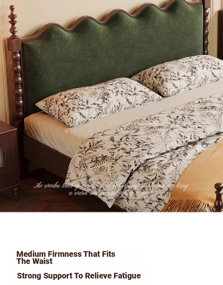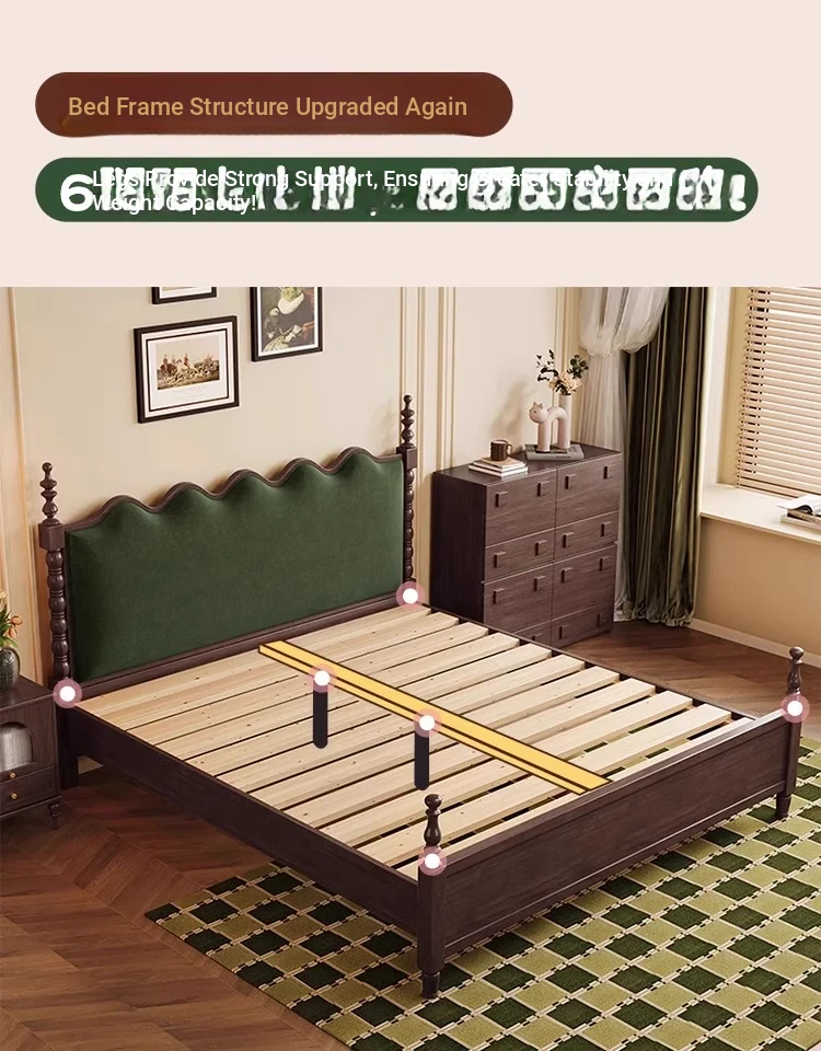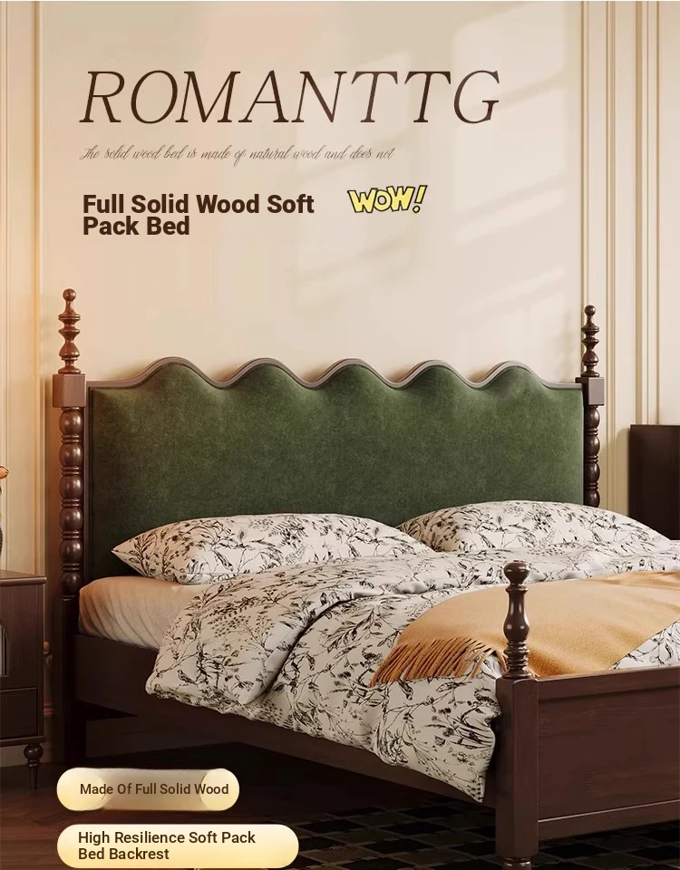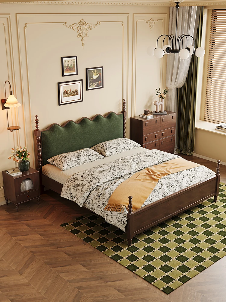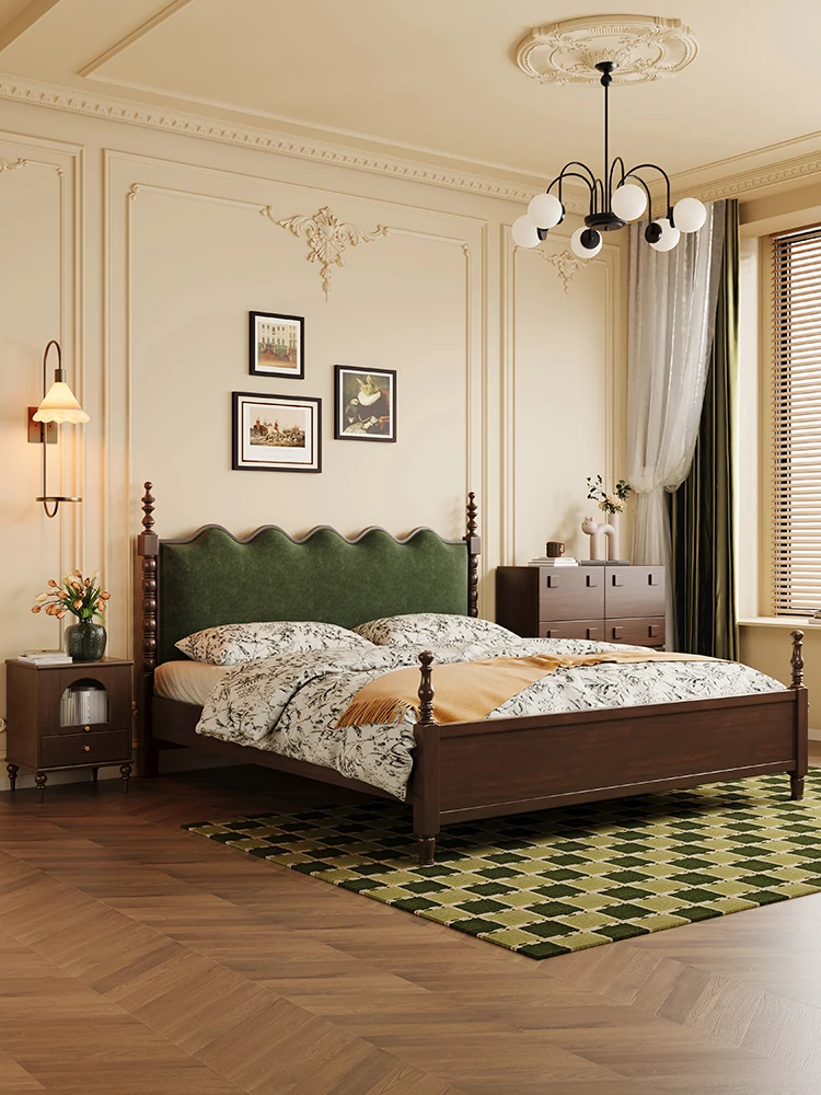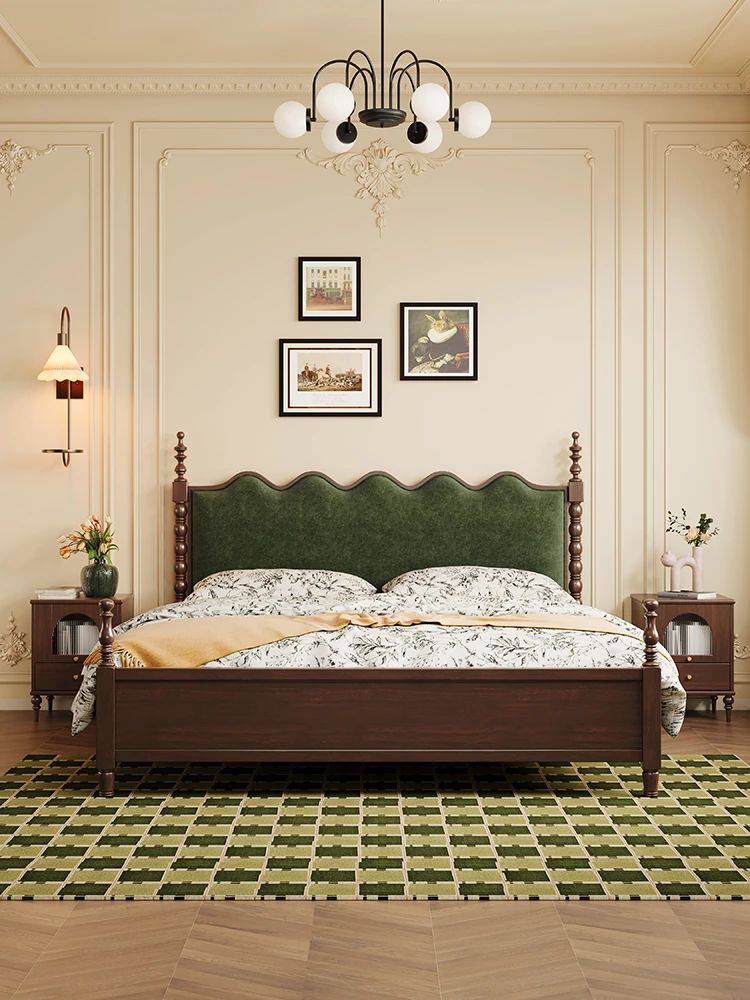 "Chic French Vintage Solid Wood Bed for Master Bedroom - 1.8m Black Upholstered Double Bed for Small Spaces"