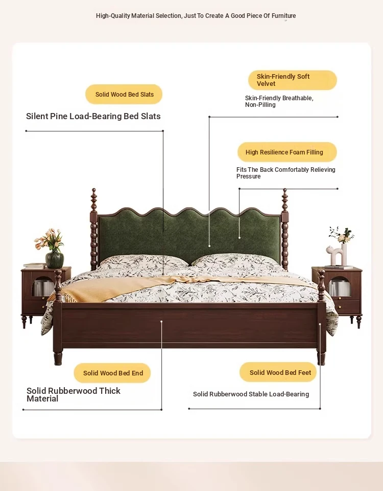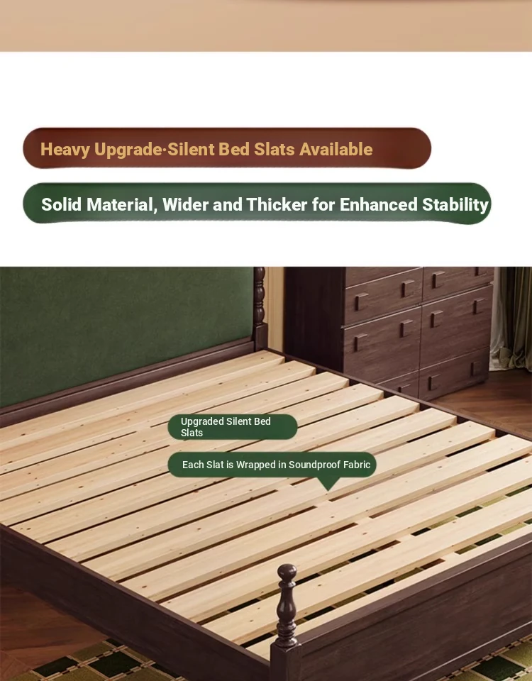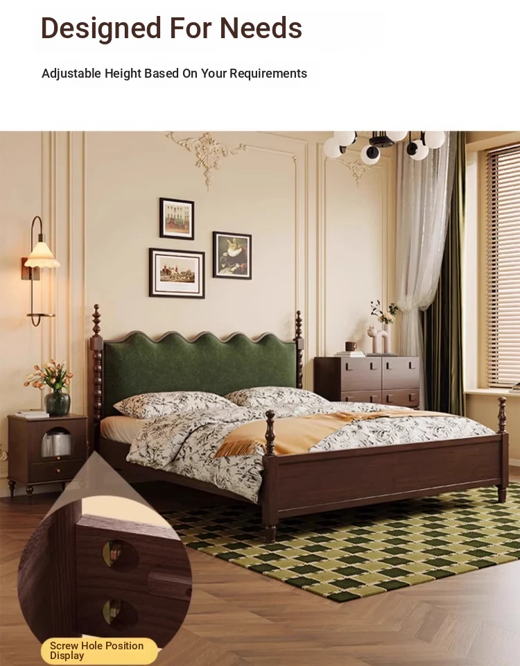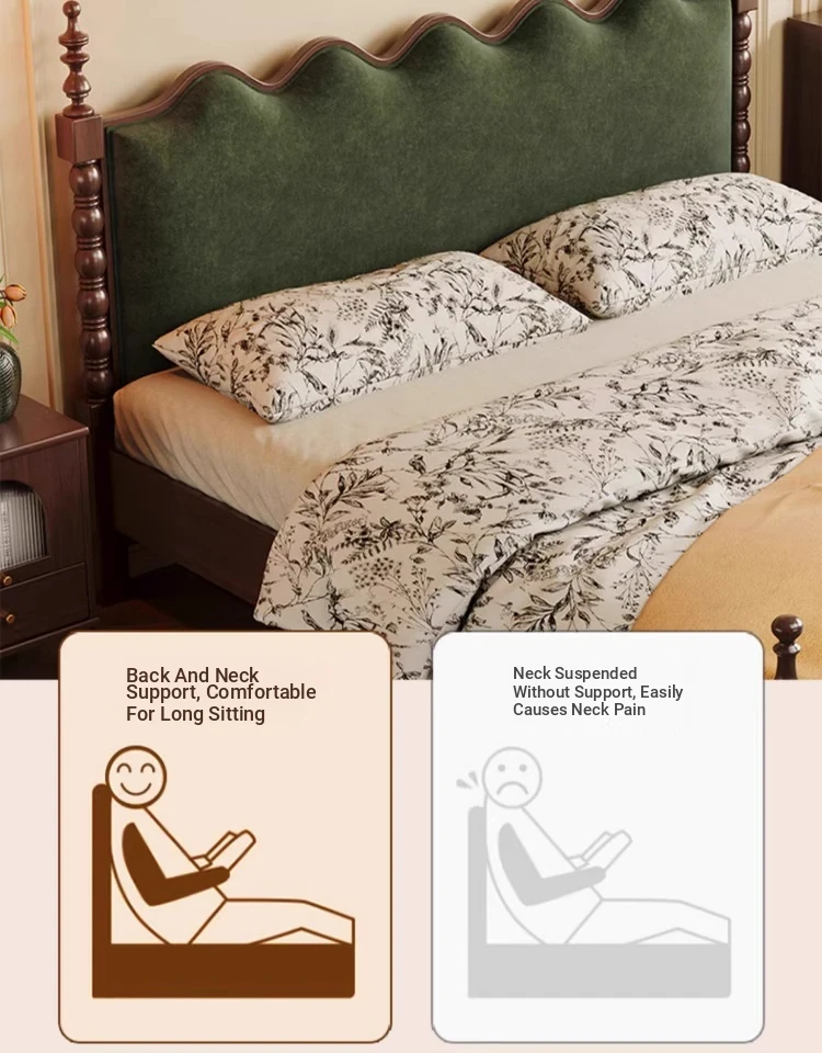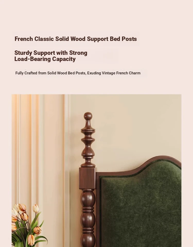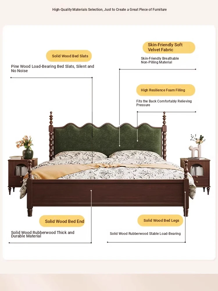 "Chic French Vintage Solid Wood Bed for Master Bedroom - 1.8m Black Upholstered Double Bed for Small Spaces"